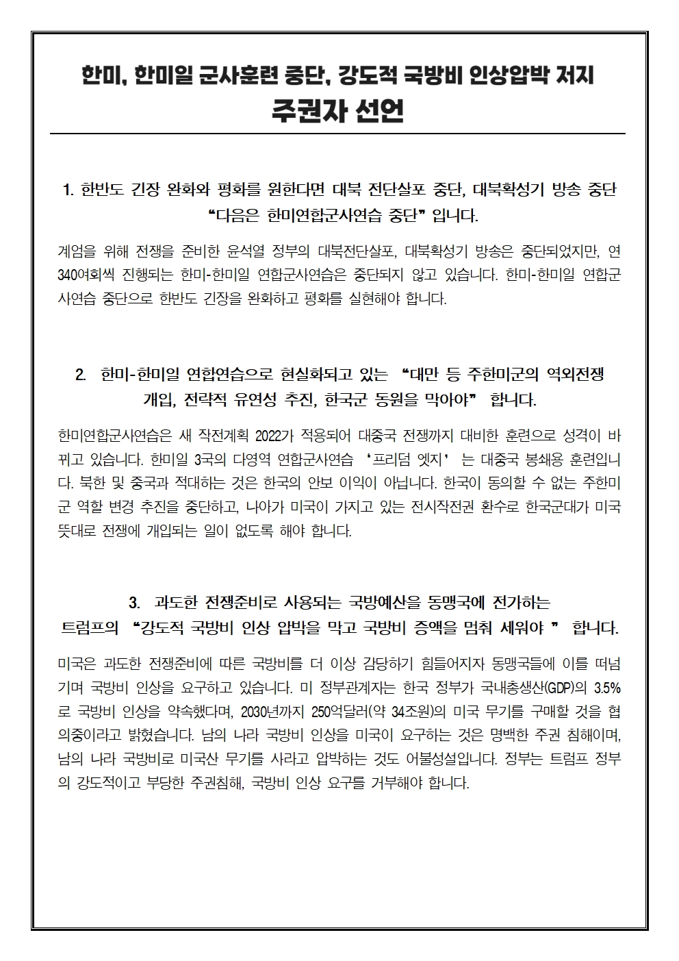 한미-한미일 군사훈련 중단, 강도적 국방비 인상압박 저지하자!